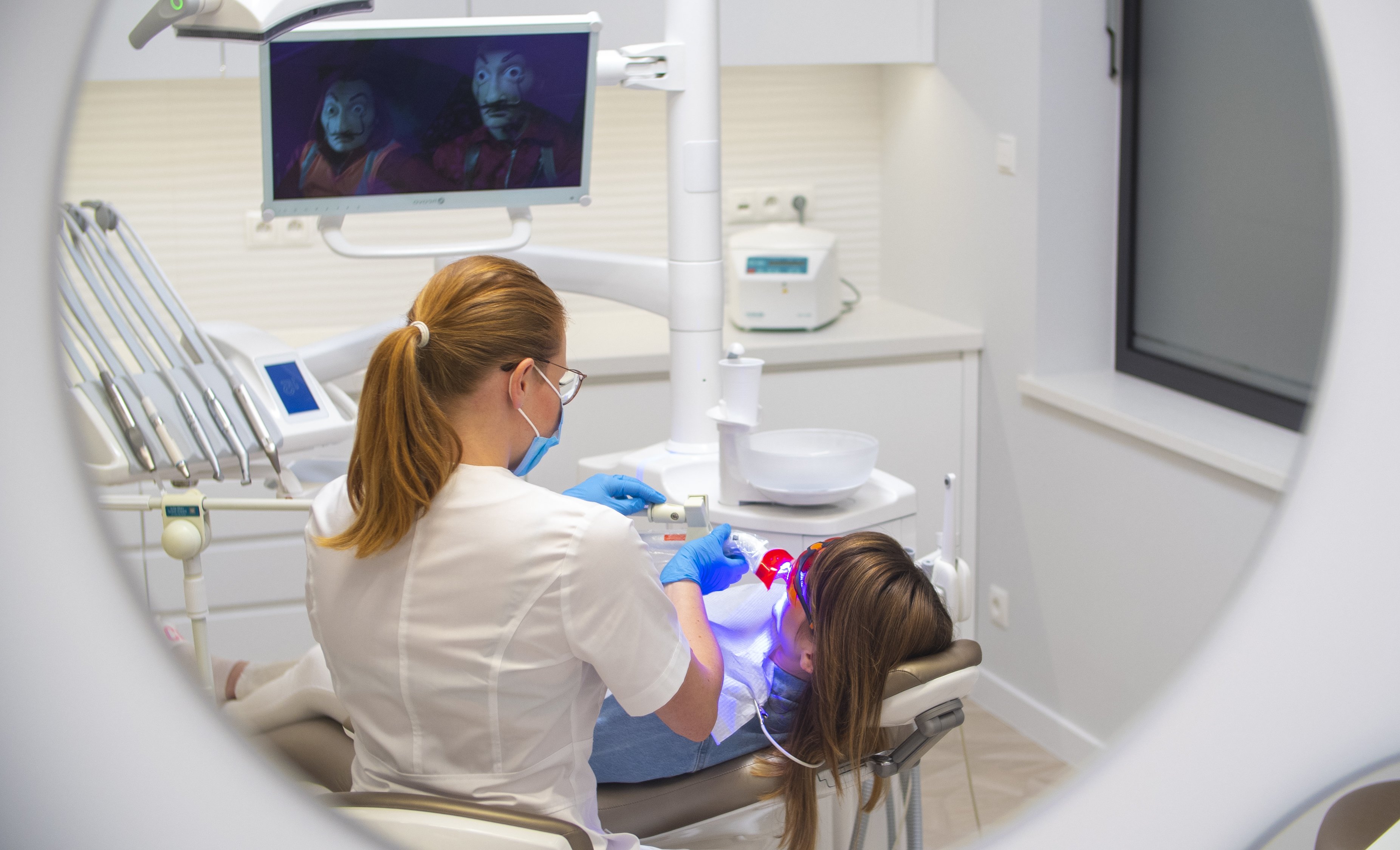 Po zabezpieczeniu dziąseł koferdamem (płynna guma nakładana na dziąsła) nakładany zostaje preparat wybielający, którego działanie dodatkowo wzmacnia lampa UV.